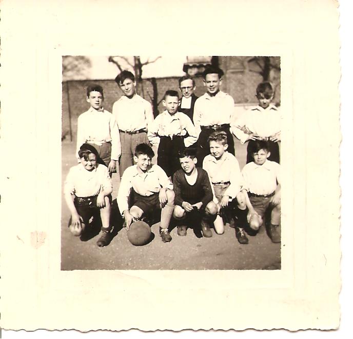 une équipe de football en 1949, avec le frère Jean. De gauche à droite :au 1er rang : Serge Desprez,Jean Deblauw,José Glissoux,Pascal Wauquier, Bernard Lefebvre Debout : Roland Hollebecq,Roger Vuylstecke,Jean Marie Vandewynckele, Claude Provost,André Six,frère Jean. photo n° 4849