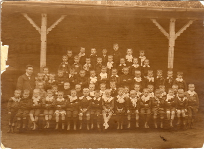 les frères maristes avec Gustave Staes, Alphonse Lacante, Melle Juliette ? , Jeanne Vanoverschelde, Jeanne d'Arc Lepers.