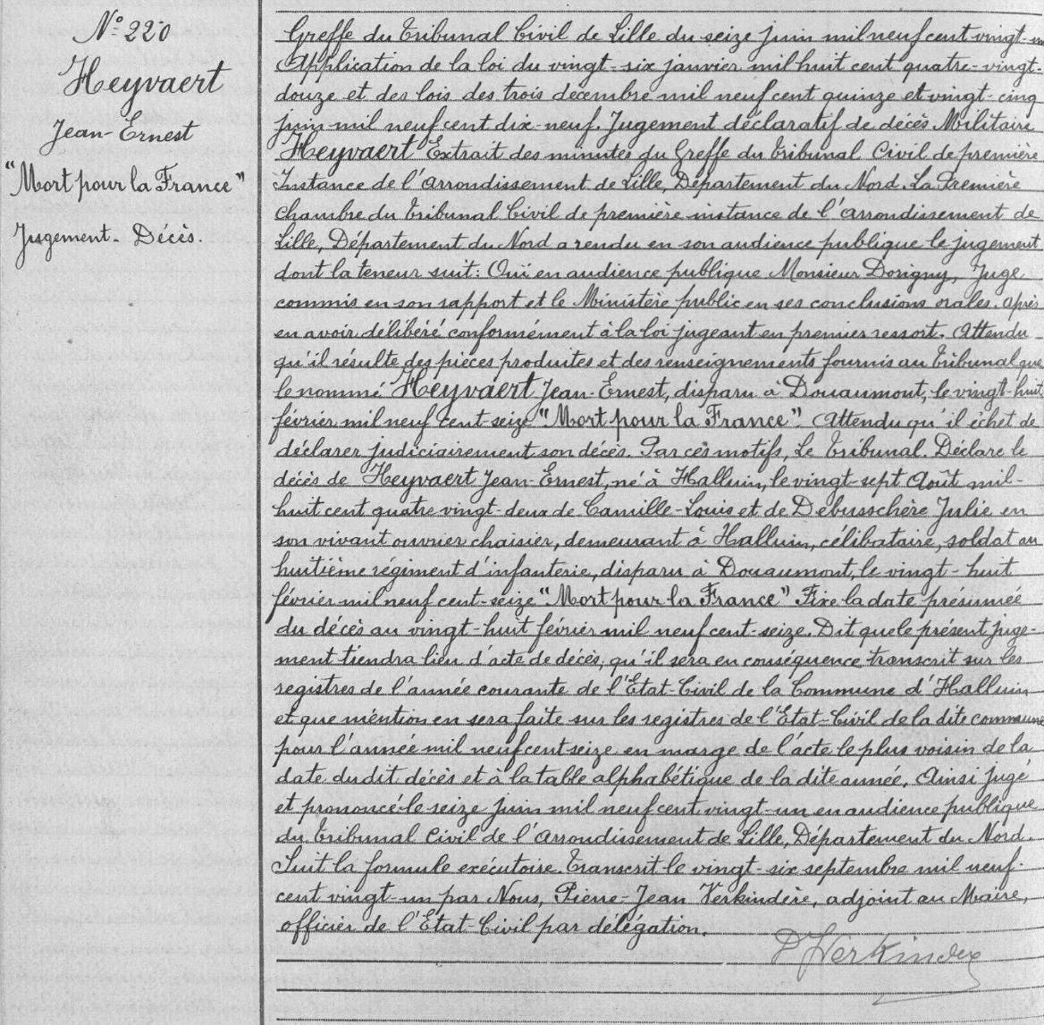 Transcription à l'état-civil d'Halluin du décès "mort pour la France" de Jean Heyvaert.