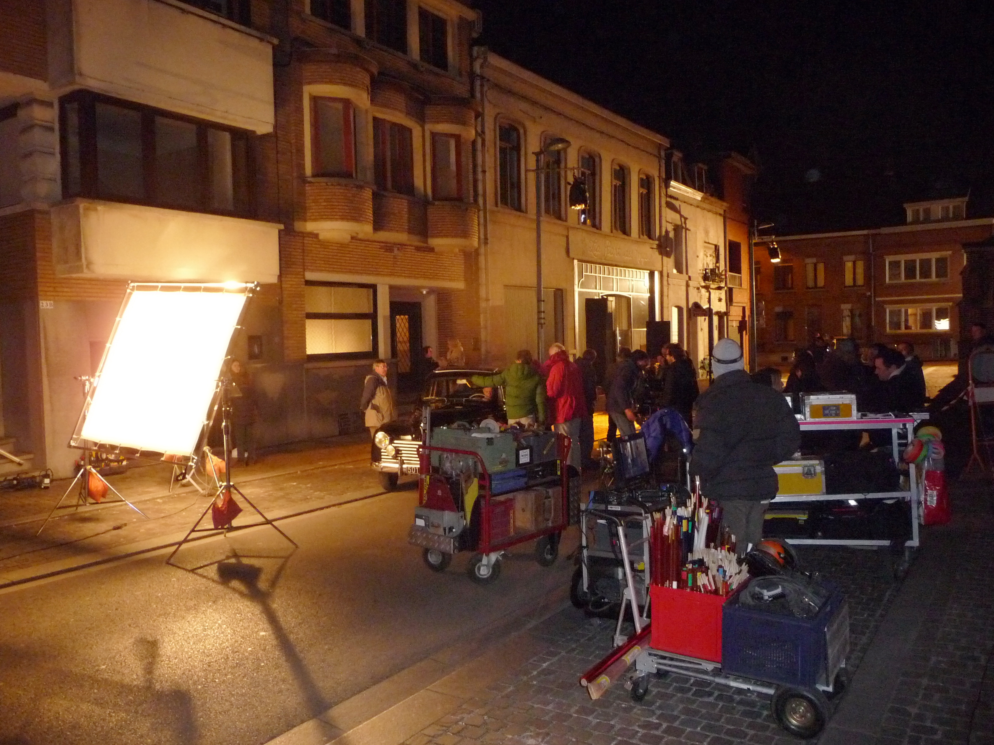 L'équipe technique prépare le décor extérieur face au Cabinet médical rue Abbé Bonpain,