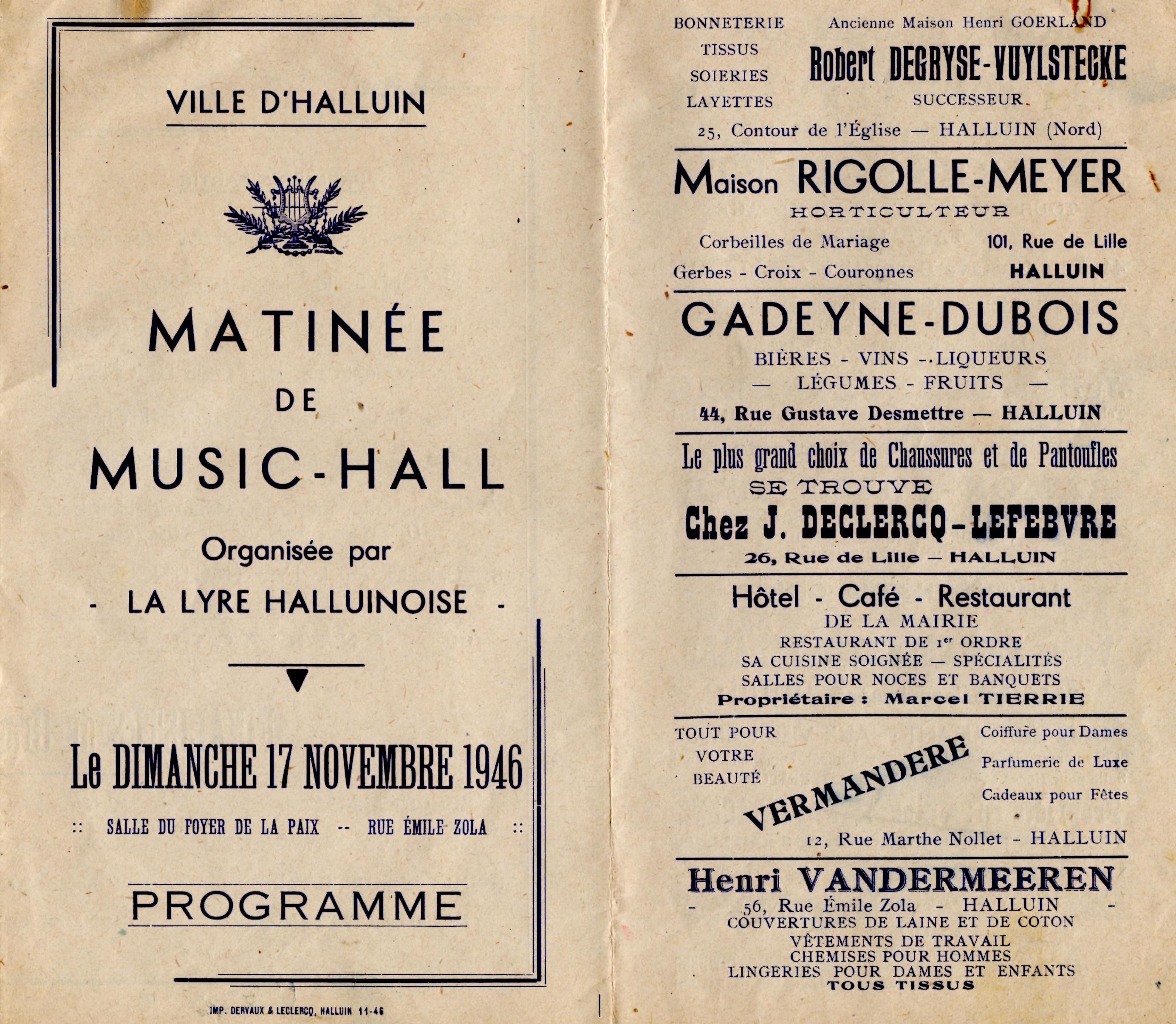 Matinée de music-hall organisée par la Lyre halluinoise le 17 novembre 1946