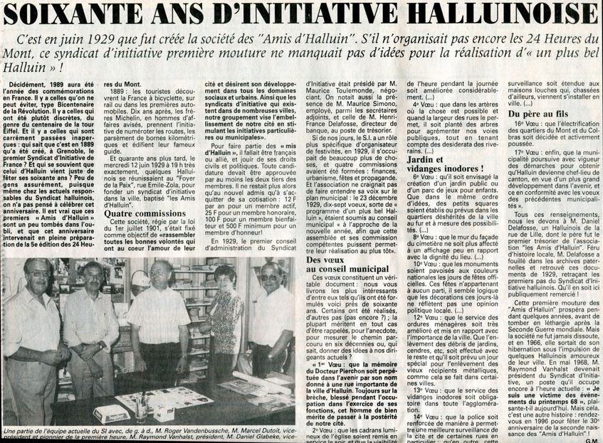 Le Syndicat d'Initiative d'Halluin n'a repris de réelles activités qu' en 1967 avec de nouveaux statuts. C'est sous la Municipalité dirigée par M. Charles Vanoverschelde et à son adjoint à la culture et à l'animation M. Jacques Depuydt, qu'a été prise l'heureuse initiative de remettre sur rail le syndicat.
