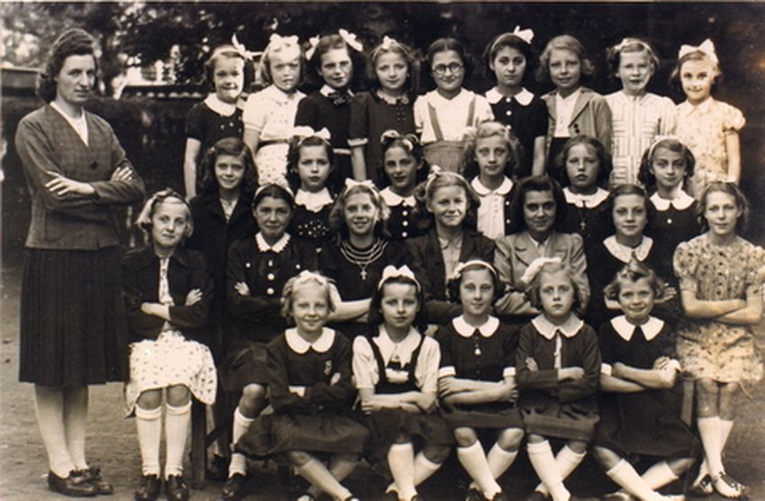 Une classe de l'école Jeanne d'Arc vers 1945/1946, avec Mlle Irène BUYL et ses élèves, de G à D :