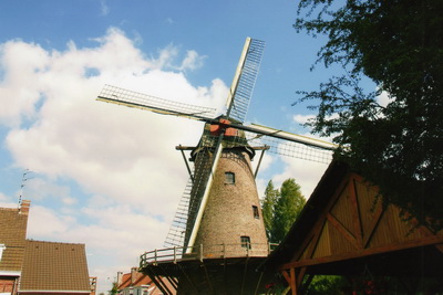 Rare vue du moulin en état de fontionner vers 1907:ce moulin fut construit par Cyrille Hollebèke meunier à Wervik(Belgique)par autorisation municipale en 1877. Avec sa tour conique et son toit mobile, il était de style "hollandais". Les ailes n'auront tourné que le temps d'une génération, elles disparaîtront avant 1914, lors d'une tempête etseront remplacées par un moteur. |