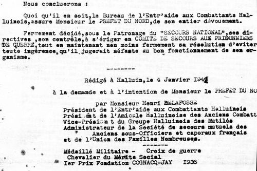 Complètement méconnu par les Pouvoirs Publics, en but aux sarcasmes de certains esprits malveillants, mais bénie par toute une population, l’entr’aide aux combattants halluinois n’en a pas moins poursuivi sa tâche, donnant à ses dirigeants la seule, mais aussi la plus belle des satisfactions, celle du devoir accompli.